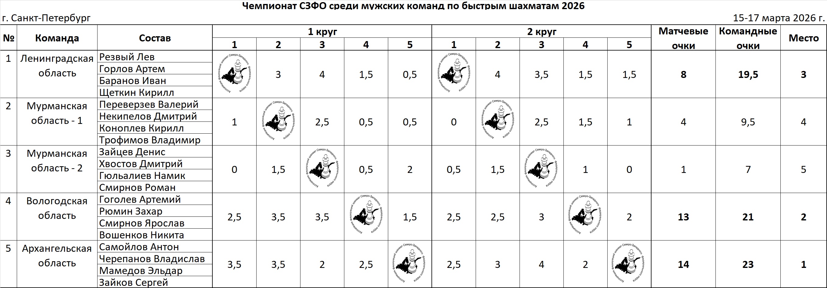 ИТОГИ Чемпионата СЗФО среди мужских команд по быстрым шахматам